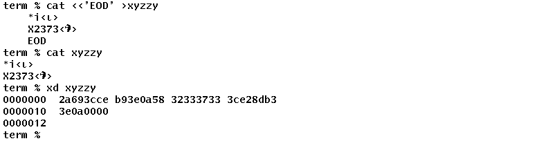Let's look at this more closely. We key in a here document that gets written to a file in which we key the ASCII shorthand characters followed by a left angle bracket, then the actual compose sequence, a right angle bracket, and Enter. The first line is for the Greek lowercase iota and the second for the APL iota. After closing the here document, we cat and xd the file. The xd clearly shows the correct UTF-8 encoding of the APL iota but the screen is rendering an unknown glyph for it.