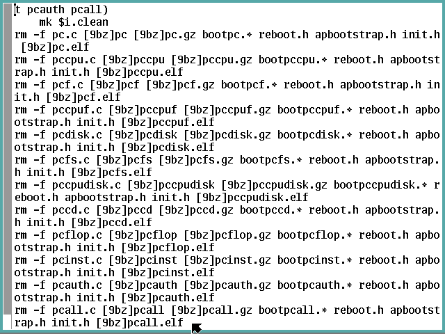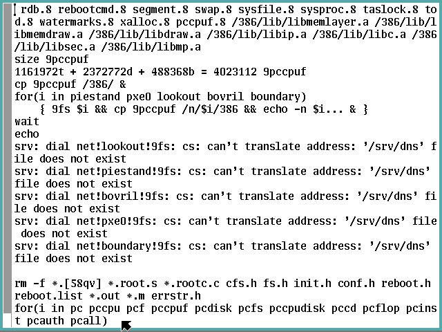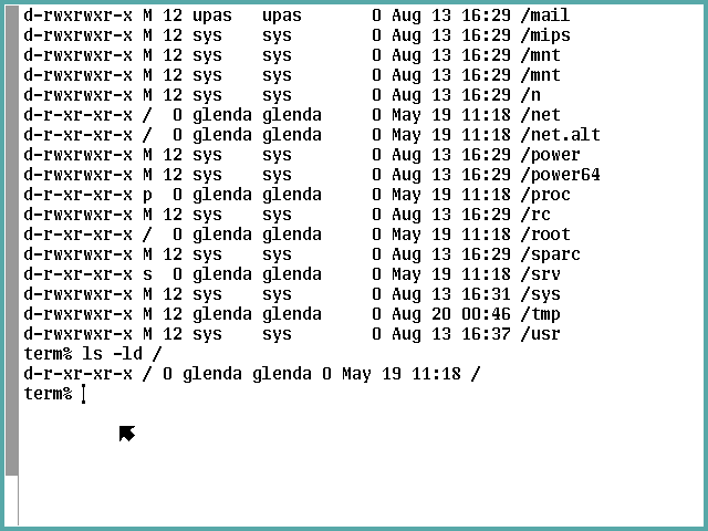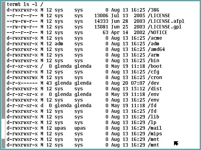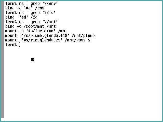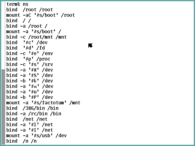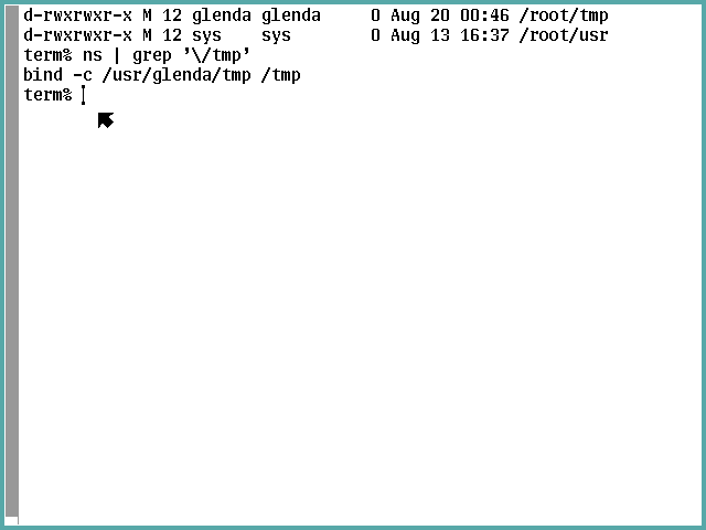 The /root directory appears to be the actual system root directory in the UNIX sense of the concept. In Plan 9 its condition is massaged into a custom view for each process group, each having its own / definition. We see this with the /tmp directory that is not a union directory but is replaced (just as a UNIX directory used as a mount point becomes hidden so it and its contents are inaccessible). The {ns | grep '\/tmp'} shows that Glenda's tmp (in /usr/glenda) is where /tmp files are served from.