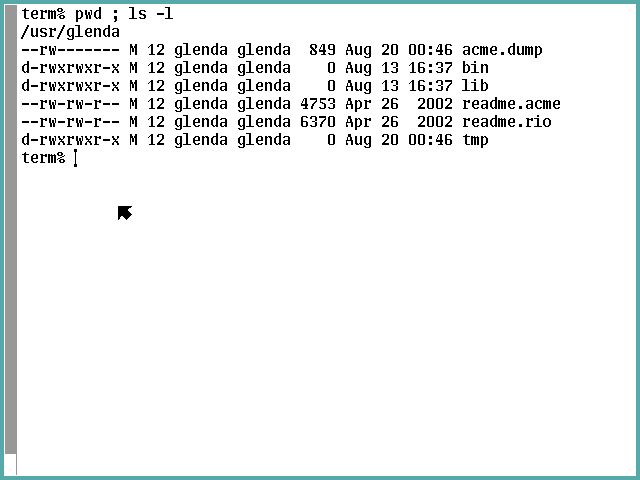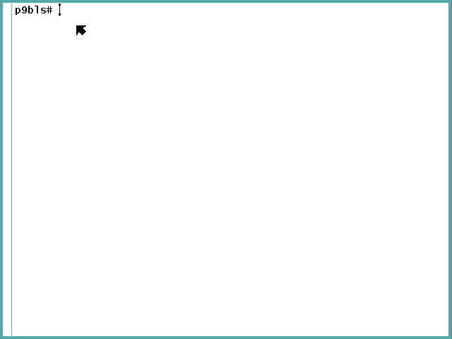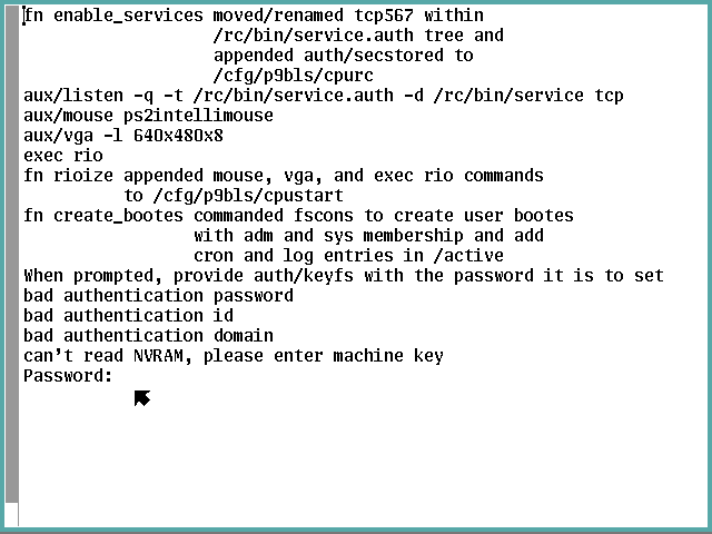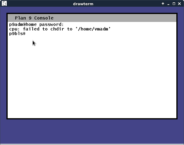 Notice this is not a rio window—there is no pointer or mouse interaction. Also the home directory does not exist. We fix all this by running the {/sys/lib/newuser} command when a new user logs in the first time. That should result in a rio environment: