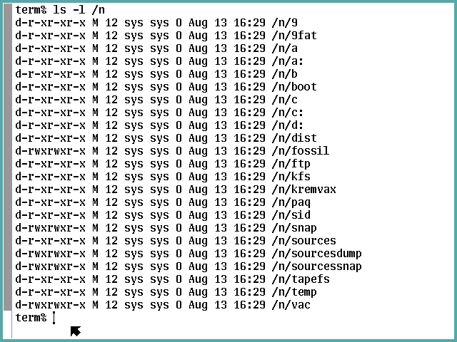 Let's look at directory namespace(4) says is "A directory containing mount points for file trees imported from remote systems" via an {ls -l /n} command (I guess the n stands for network):