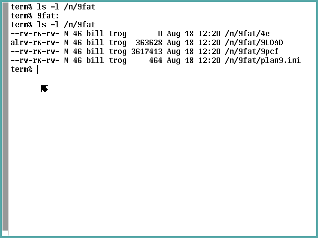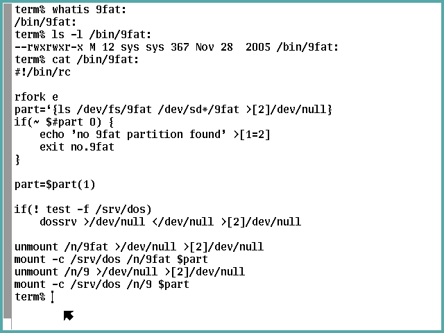 So we need to run the {9fat:} command according to the Installation Instructions, eh? There isn't a man page for that. The rc shell's whatis builtin command says it's external to the rc(1) shell (and you really want to make some time to study that man document—rc is neither sh nor bash). So we invoke an {ls -l /bin/9fat:} command, see it's small, and just issue a {cat /bin/9fat:} command to print the whole thing: