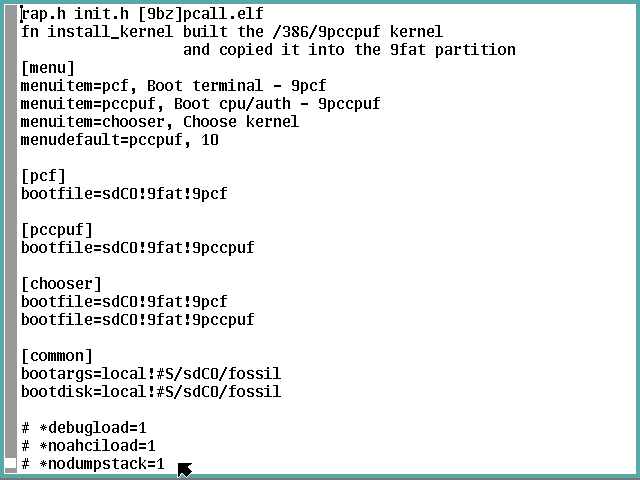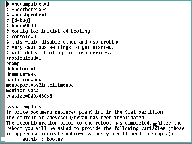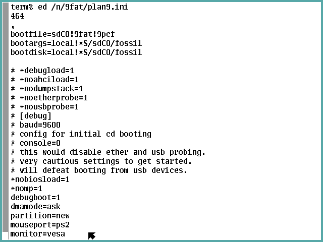 If you're up for using sam(1) or acme(1) you won't need to do exactly what I document here using ed(1) . After launching an {ed /n/9fat/plan9.ini} command and seeing it loaded the expected number of bytes into the ed buffer, use a {,} subcommand to display all lines in the buffer (well, technically that's a target that defaults to the first and last lines (and everything in between) with a null subcommand that defaults to p for print):