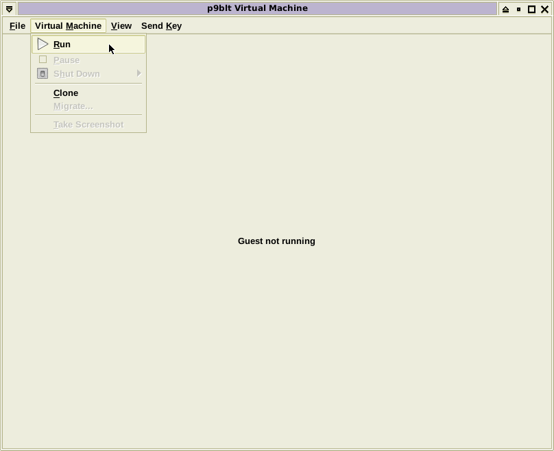 Now we ensure we have the XFCE pointer, then left-click on the Virtual Machine item in the menu bar, mouse-over the Shut Down item that drops down, and left-click on the Force Off item that pops up, then left-click on the Yes icon in the lower left of the confirmation dialog that pops up. This destroys the instance of the vm (it's still a defined vm) and displays the status window below. Now we left-click of the Virtual Machine item in the menu bar once more, but this time we left-click on the Run item that drops down:
