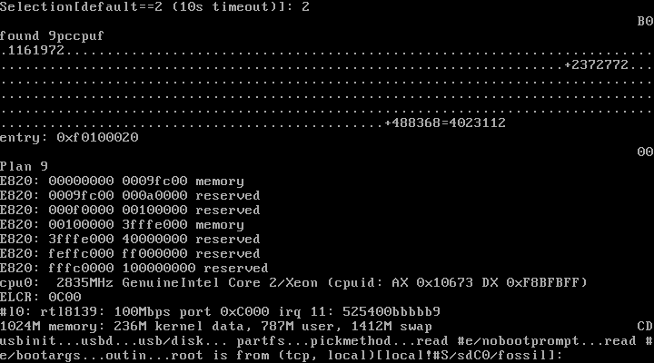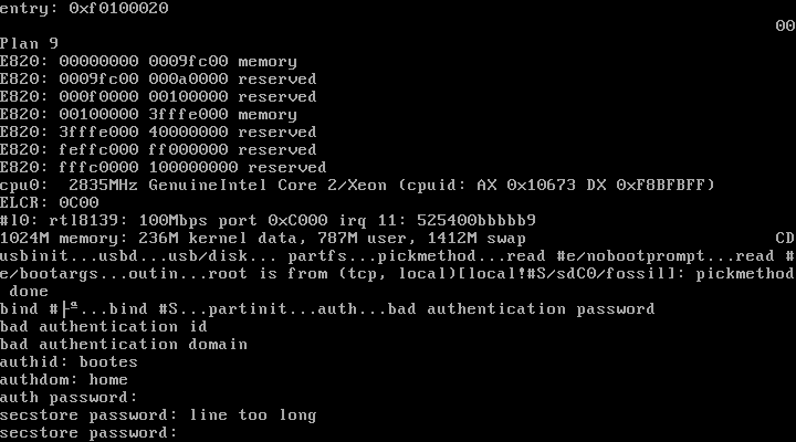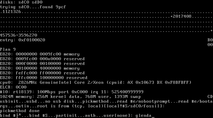 This creates a new instance of the vm and starts it booting. Respond to the root prompt appropriately (the default should still be correct), and specify {glenda} as the user again.