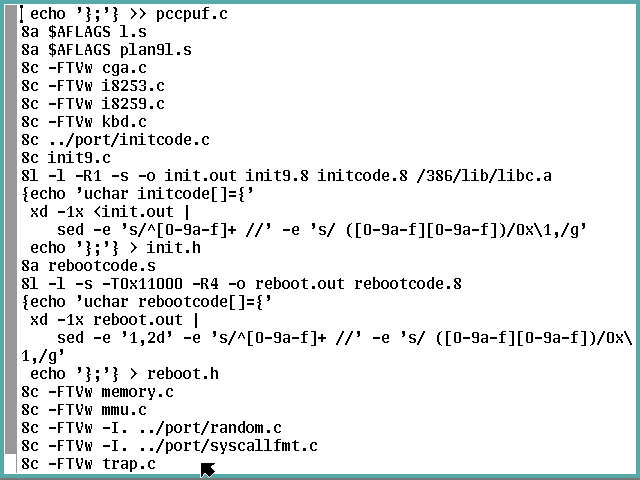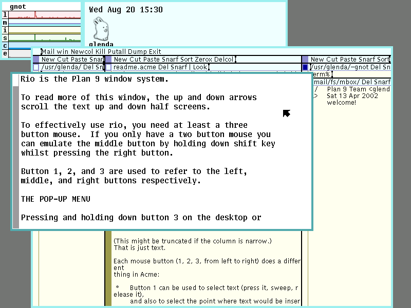 We should see Plan 9 has customed the windows to make better use of the available pixels if we expanded vgasize—here's 800x600 (but the cookbook will continue along in 640x480 to simplify screenshot handling):