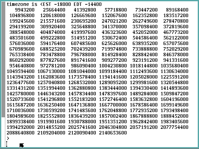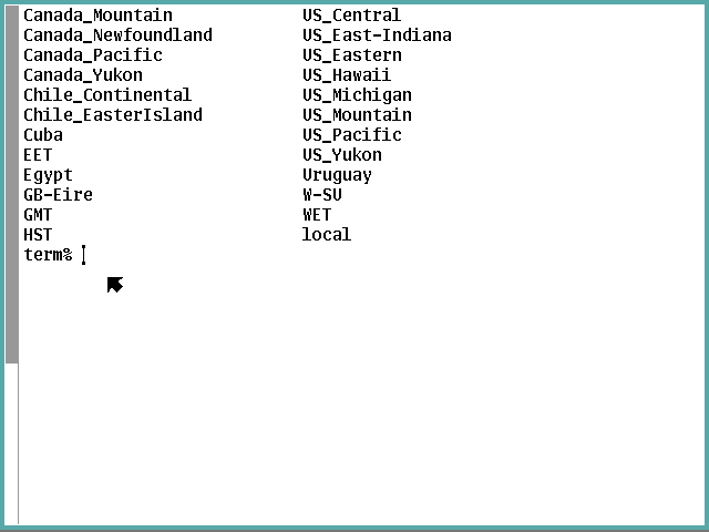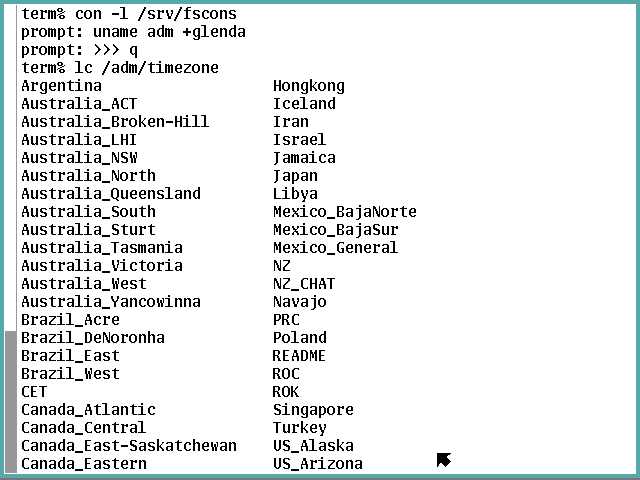 Now we need to determine what our time zone options are, so we'll just see what we have to work with via a {cd /adm/timezone && lc} compound command: