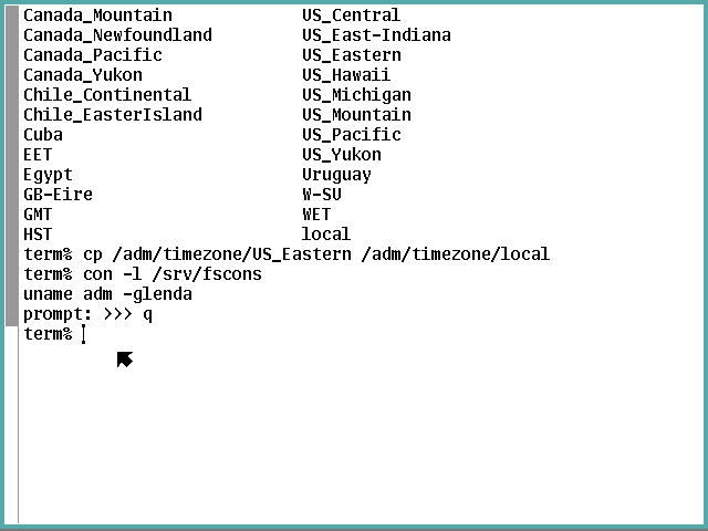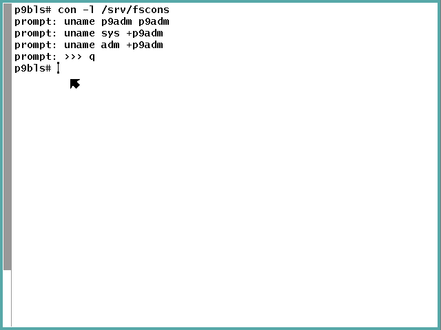 The con(1) command and the fossilcons(8) server man pages explain the magic we are about to invoke to empower glenda to act as adm. First we launch a session with the fossil console by launching a {con -l /srv/fscons} command which encourages us to continue with a prompt (sometimes fscons is the party in need of encouragement via Enter). Then we instruct it to make the change via a {uname adm +glenda} subcommand, which fscons indicates was not a problem by giving us another prompt. All that remains now it is say goodbye by escaping the session dialog via Ctrl-\, {q}, and Enter.