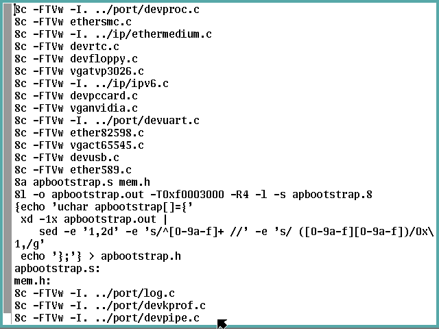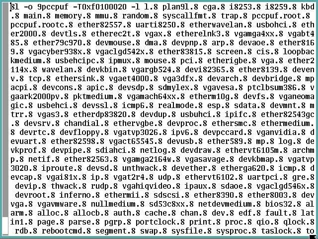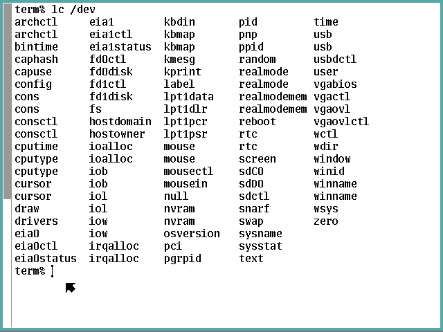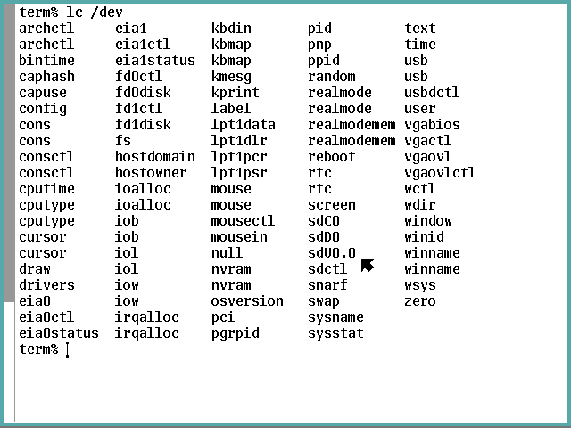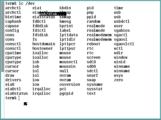 When we know Plan 9 is now aware of the USB-stick, we issue the {lc /dev} command again to see what its file name is:
