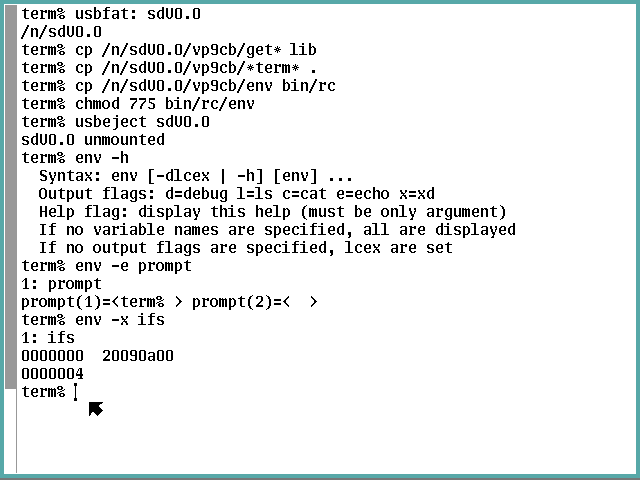 We need to make that directory of text files available to Plan 9 by mounting sdU0.0 as a vfat filesys. We do that, according to the usb(4) man page, by running a {usbfat: sdU0.0} command, which tells us where to find the USB-stick's root directory. Now we can compose the commands to copy the text files where they need to be installed within /usr/glenda and also set the executable flags for bin/rc/env while we're at it, then dismiss the the USB-stick via a {usbeject sdU0.0} command (detaching the stick from the vm is left as an exercise for you (hint: look for the Remove icon in the panel for the USB-stick device).