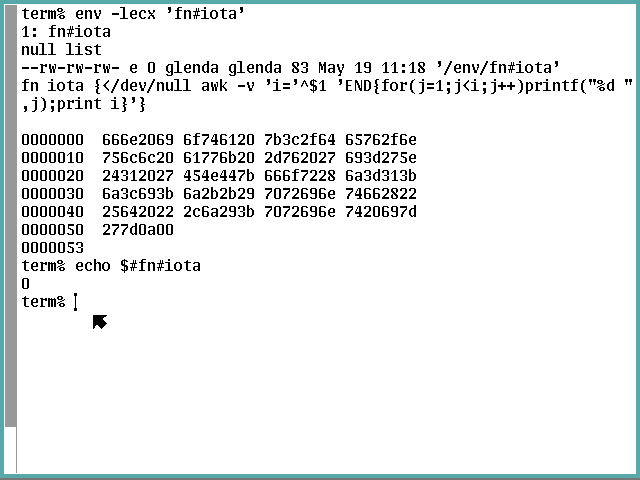 Because, in this context, a naked sharp would be interpreted as a comment-starter by rc, the variable name must be escaped by enclosing it within apostrophes (there is no other escape mechanism rc supports). The echo display only says "null list" because, as the {echo $#fn#ι} command following shows, the list contains zero elements, and echo doesn't deal with empty lists well (notice the sharps don't need to be escaped in this context). The ls display shows the variable is indeed a file backed by the #e driver and certainly does not hold zero bytes. The cat display shows the actual function that was defined in the env command and persists after it ends (which is why the following echo command has something to work with). To unset a Plan 9 variable, use the rm command on its /env directory entry.