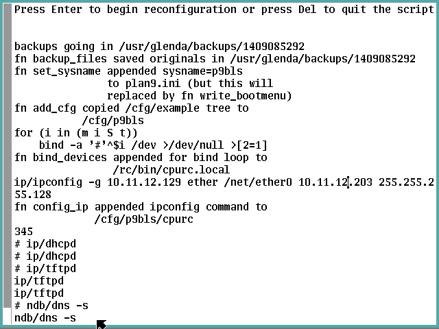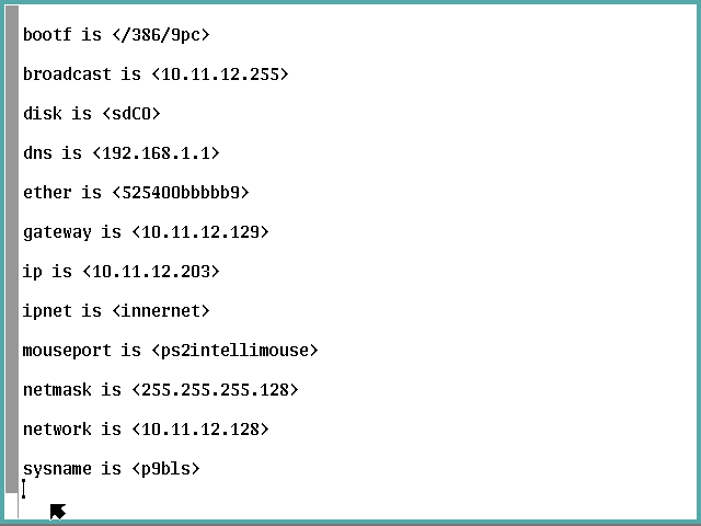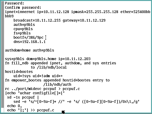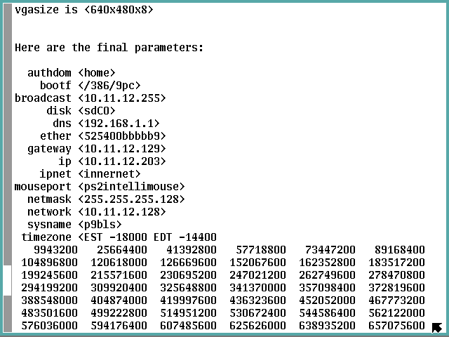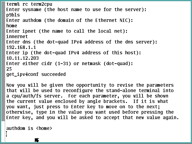 We are immediately asked the first of six questions. Answer this one with the host name you have defined in your DNS zone for this cpu/auth server. Answer the second question with the domain name in which you have defined this cpu/auth server. Answer the third question with the name you wish to use in the ipnet entry in the /lib/ndb/local network database for the IPv4 subnet to which you have connected this cpu/auth server (this is Plan 9 internal use, not a concern of DNS). Answer the fourth question with the IPv4 address of the primary DNS server this cpu/auth server is to query (in dot-quad format; i.e, a.b.c.d where a, b, c, and d are unsigned decimal numbers between 0 and 255 inclusive). Answer the fifth question with the IPv4 address of this cpu/auth server (in dot-quad format). Answer the sixth question with either the CIDR (number of network bits in the previous IPv4 address, which must be between 1 and 31 inclusive) or the netmask associated with the previous IPv4 address (in dot-quad format).