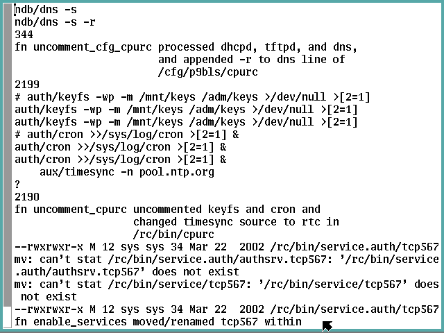 The stand-alone terminal ISO does not permit logging on as the adm user, so we cannot do as the Installation Instructions instruct. However, glenda can authorize glenda to access the namespace as though the user is adm (I told you the security of this system out of the box isn't ready for the Internet).