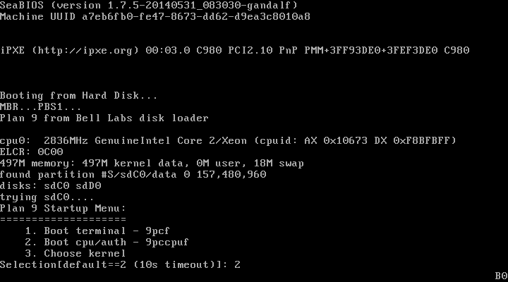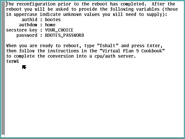 Our virtual machine environment seems to require us to to cycle the vm's virtual power for Plan 9 to be able to use see some types of reconfiguration when rebooting, so we modify the procedure documented in Installation Instructions under the Shut Down heading. We command {fshalt} and let the system quiesce to the following point: