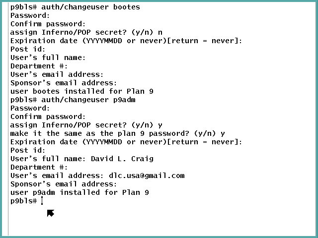 Now run an {auth/changeuser} command for the administrative account you want, changing my p9adm user name to whatever you wish. This time reply {y} to the Inferno/POP prompt and use the same password or another according to your project's requirements. Use your real name and email for this account so folks can find you if they need to.