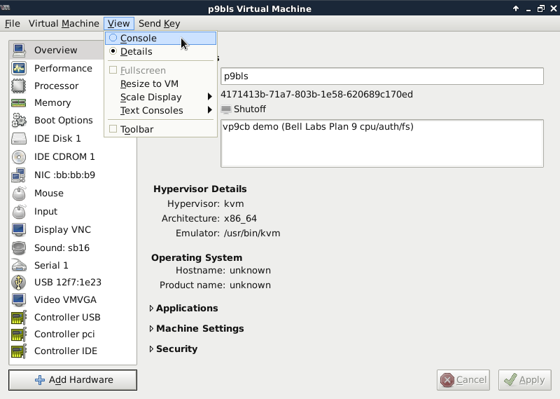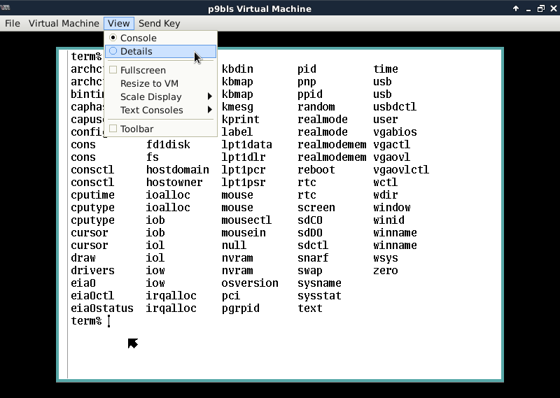 This procedure will transfer use of the USB-stick from the Sid host to the Plan 9 vm. We begin by left-clicking on the View item on the menu bar, then left clicking on the Details radio button that drops down to switch the screen from the console to the vm control panel, like so: