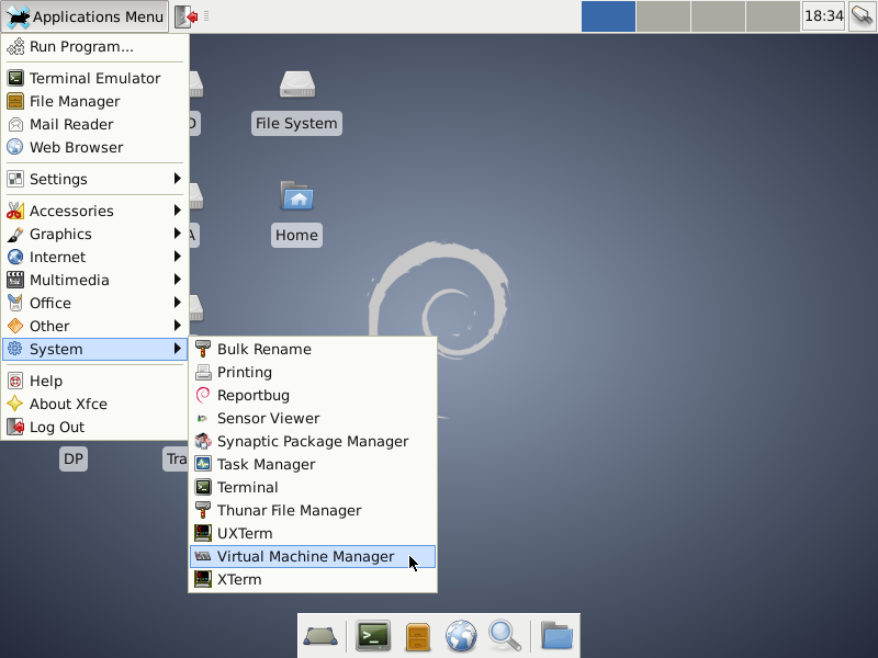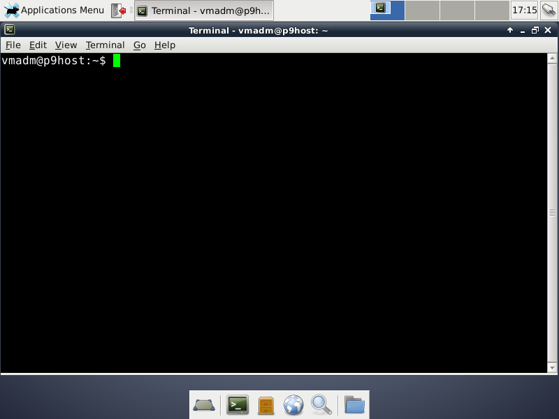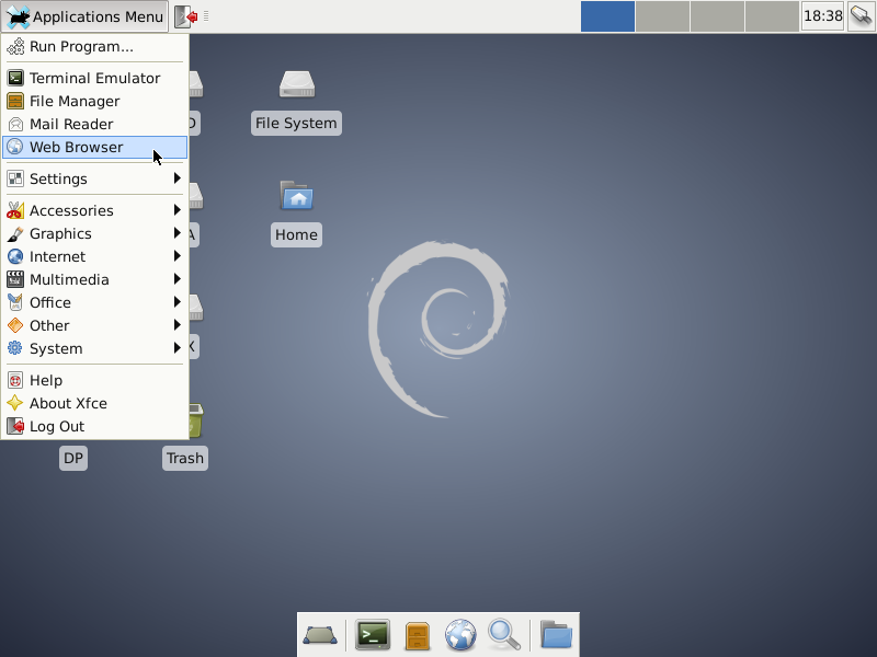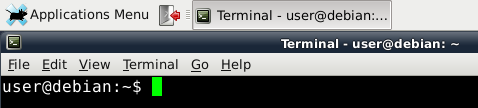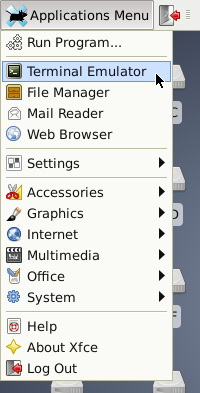 If Debian or XFCE are new flavors of GNU/Linux for you, spend some time if you can spare it exploring the available applications while running from the USB-stick. To get a terminal window, first left-click on the Applications Menu icon in the upper-left corner of the screen, move the cursor to the Terminal Emulator menu item, which will highlight, and left-click on that, causing the window to open, like so: