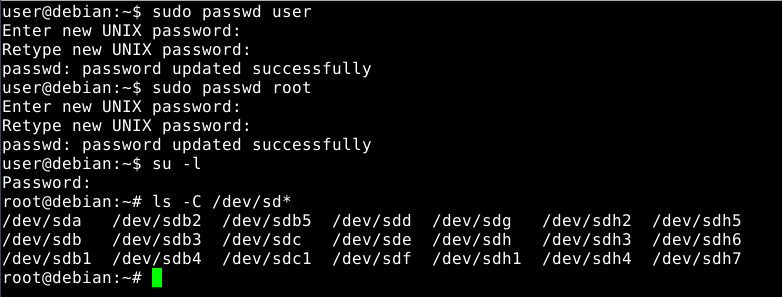 Notice Debian Live provides an account named user without any authentication requirement, and root has no password so you cannot log on as root. Thus, an excellent habit to get into when booting a live system is to immediately set those passwords. To reset the user password without knowing it, use your active sudoer status by typing "sudo passwd user", pressing the Enter key, and responding to the two prompts with the string of characters you want to use for the user password. Then use a "sudo passwd root" command and set a password for root in the same manner. Now issue a "su -l" command to log on as root specifying the password just set when prompted.