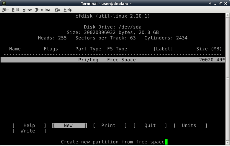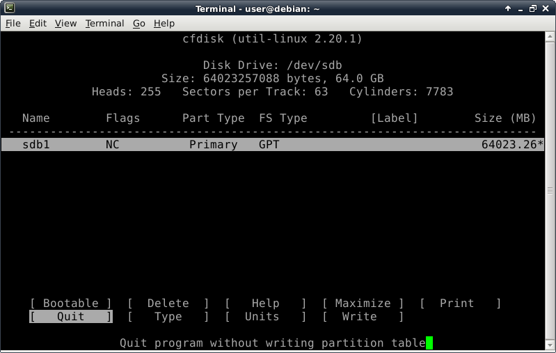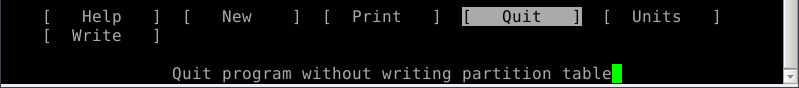 but I won't have to tab twice to quit because cfdisk knows that's all I can do at this point.