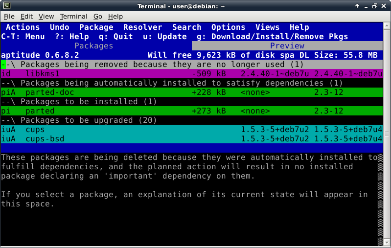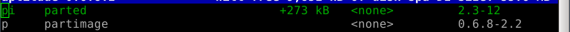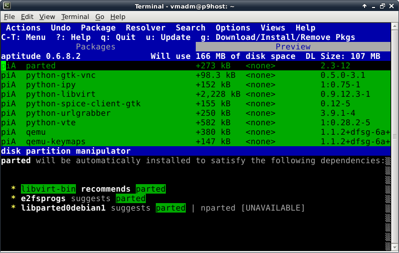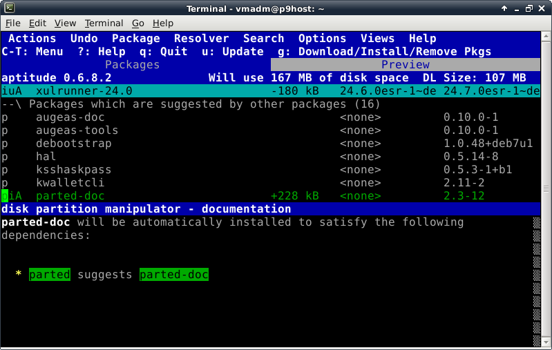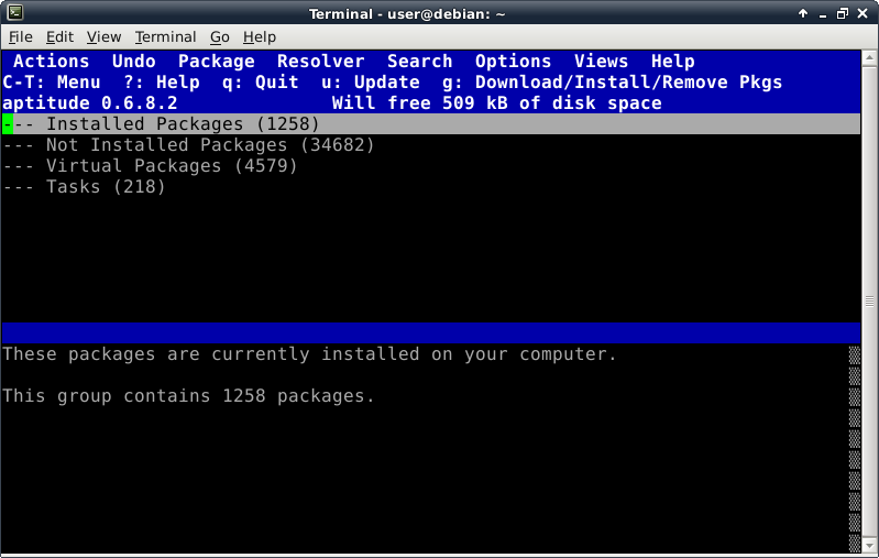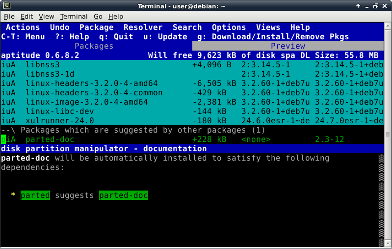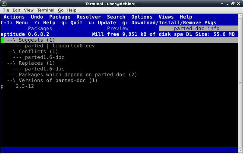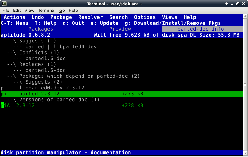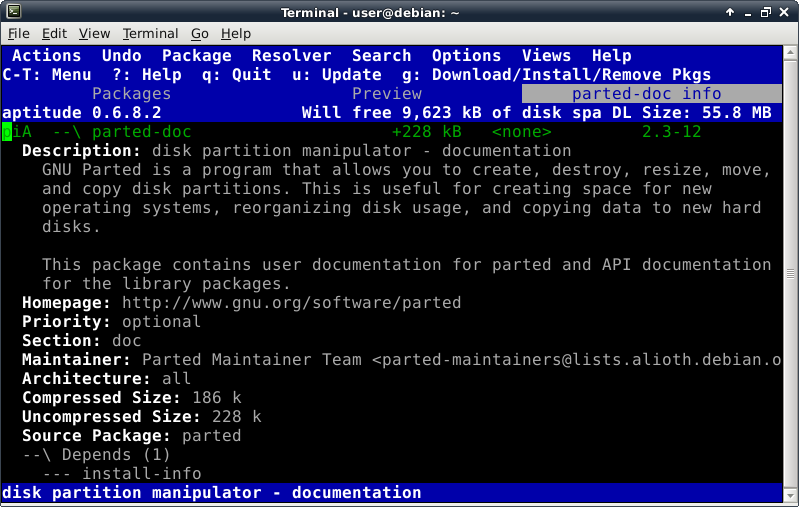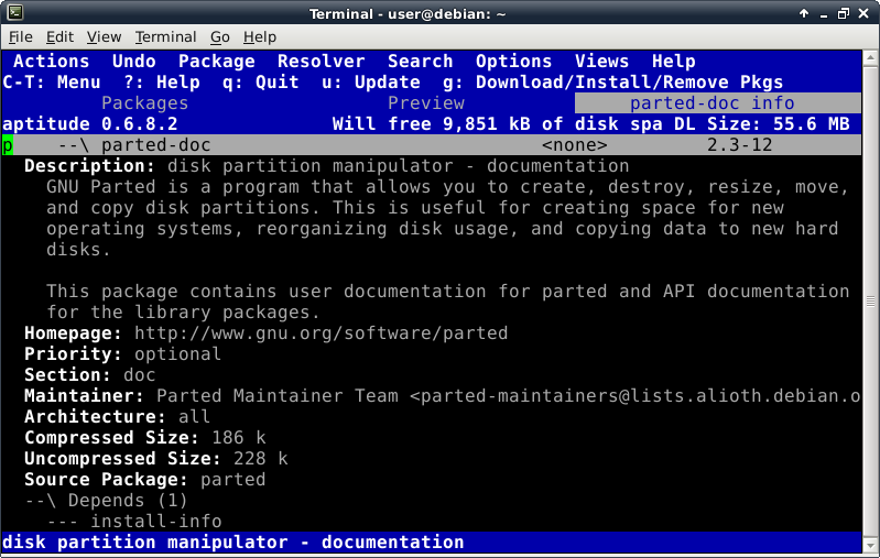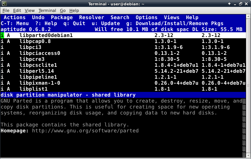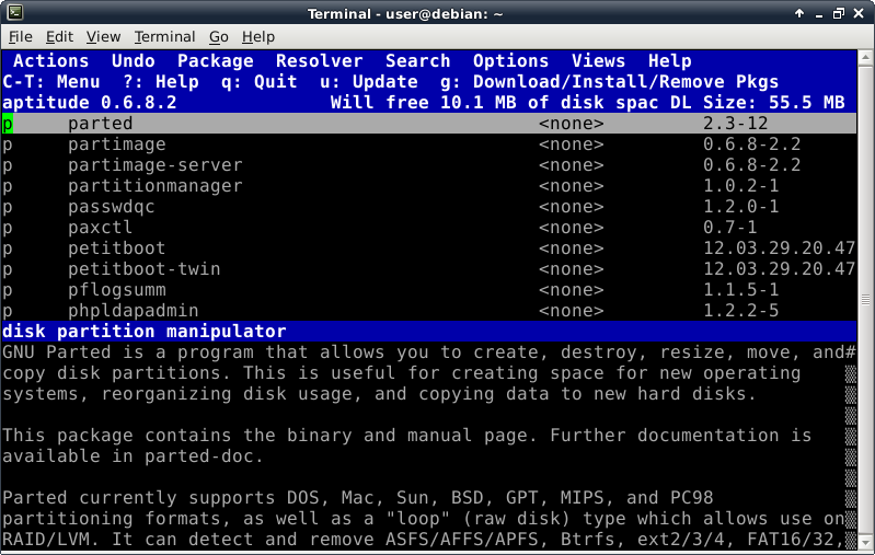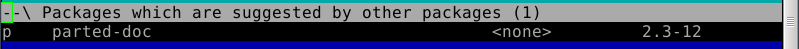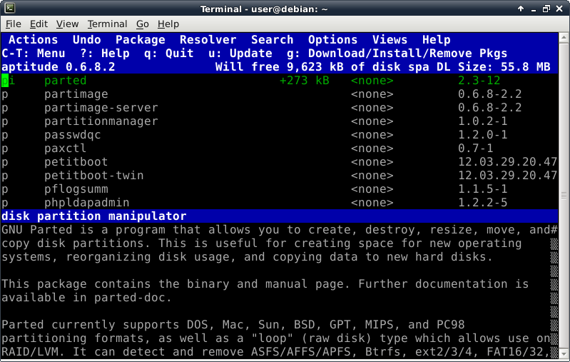 Oddly enough, even though the Debian Live installer does support GPT disks, the parted command is not included at this time in the ISO. This introduces a lovely opportunity, in order to install the parted package, to show off one of Debian's package management tools, which looks like this after launching the "aptitude" command: