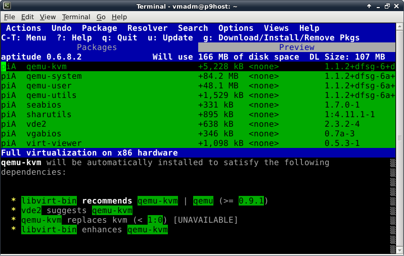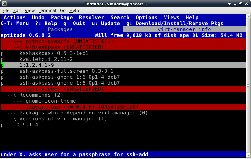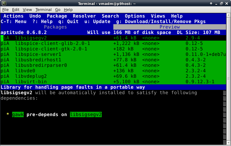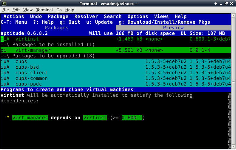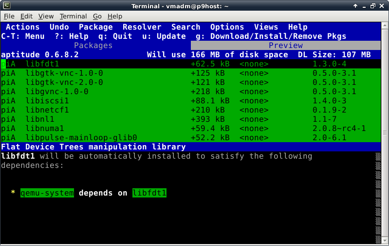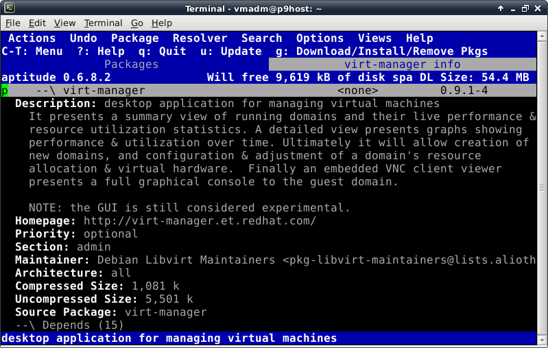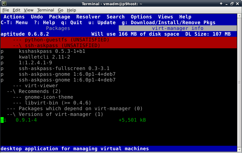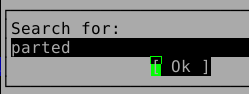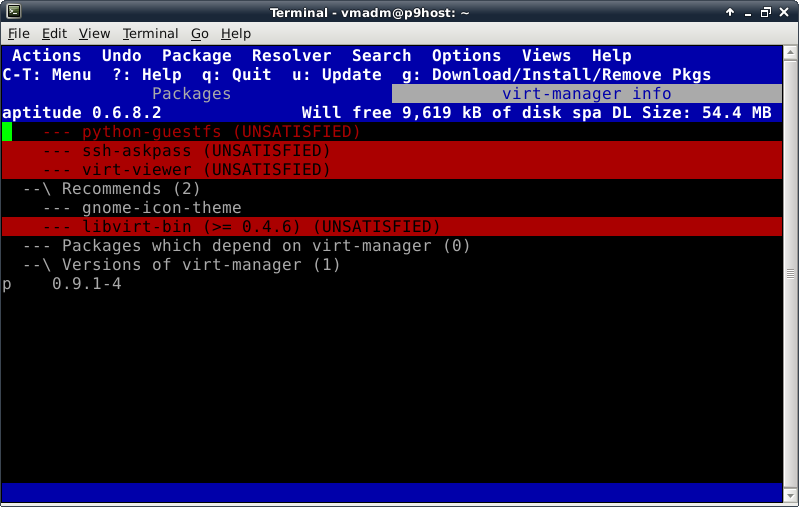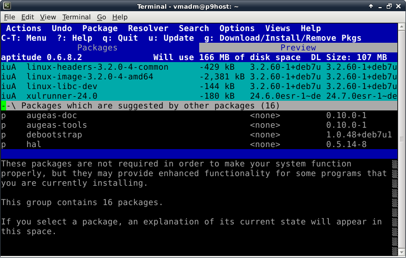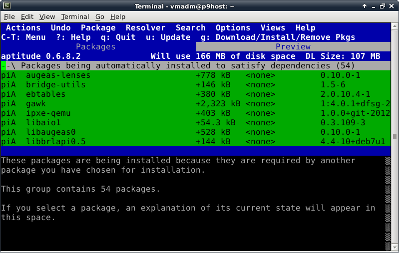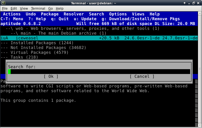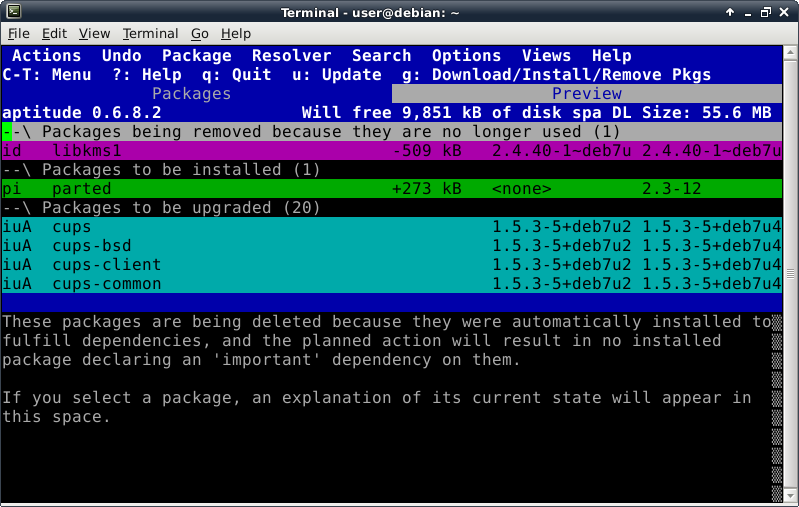 Oddly enough, even though the Debian Live installer does support GPT disks, the parted command is not included at this time in the ISO. This introduces a lovely opportunity, in order to install the parted package, to show off one of Debian's package management tools, which looks like this after launching the "aptitude" command: