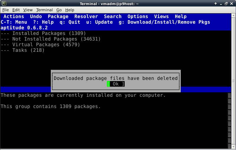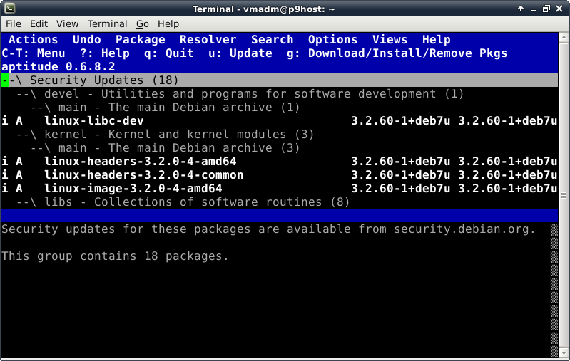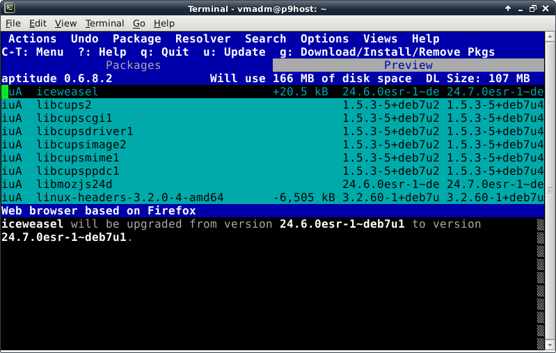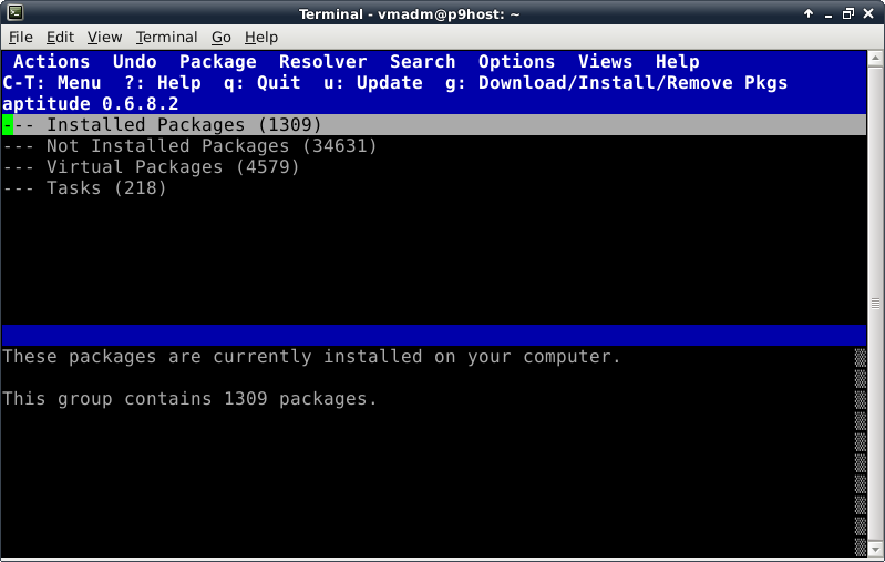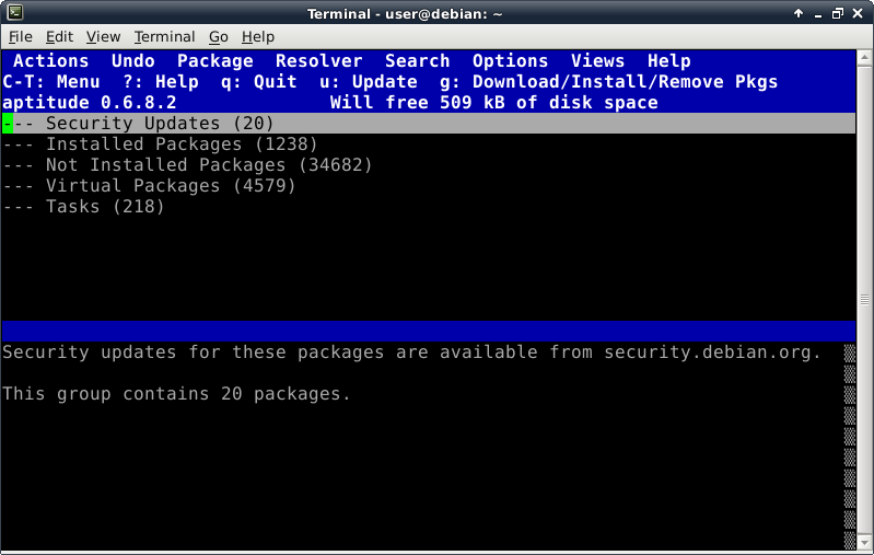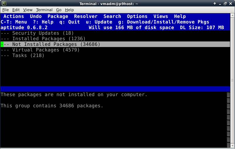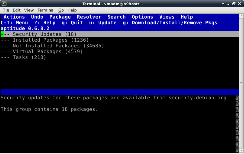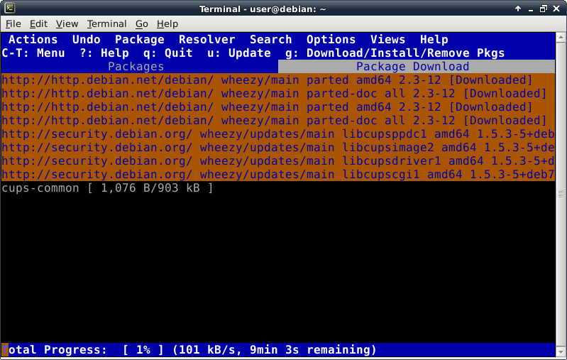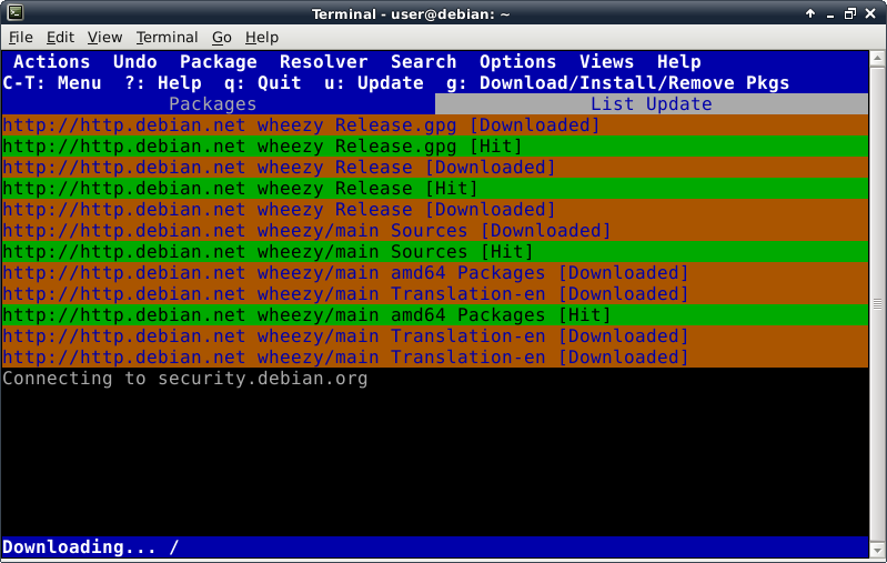 Before trying to install anything using aptitude, make the repository information up-to-date by pressing the lowercase "u" key (for update). Now we verify Internet connectivity is functioning properly. A lot of activity will be displayed looking something like this: