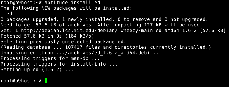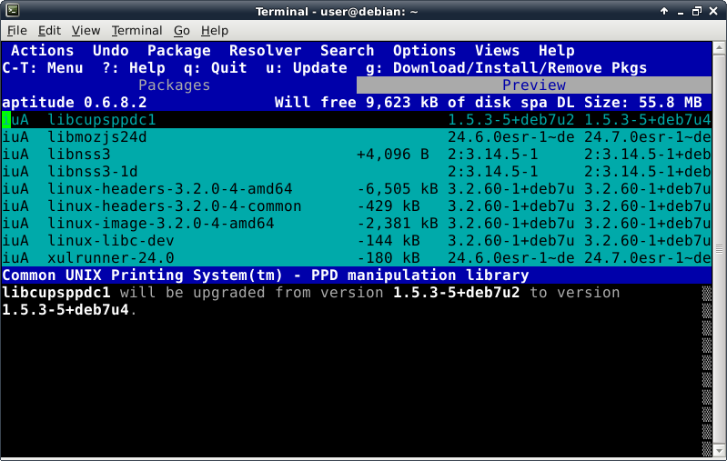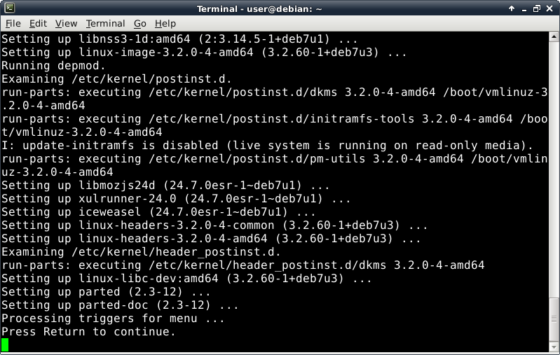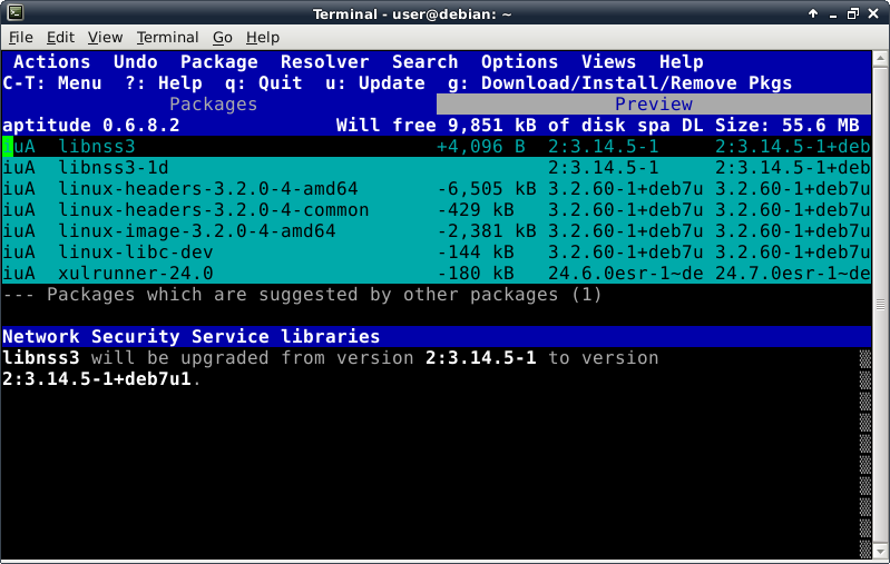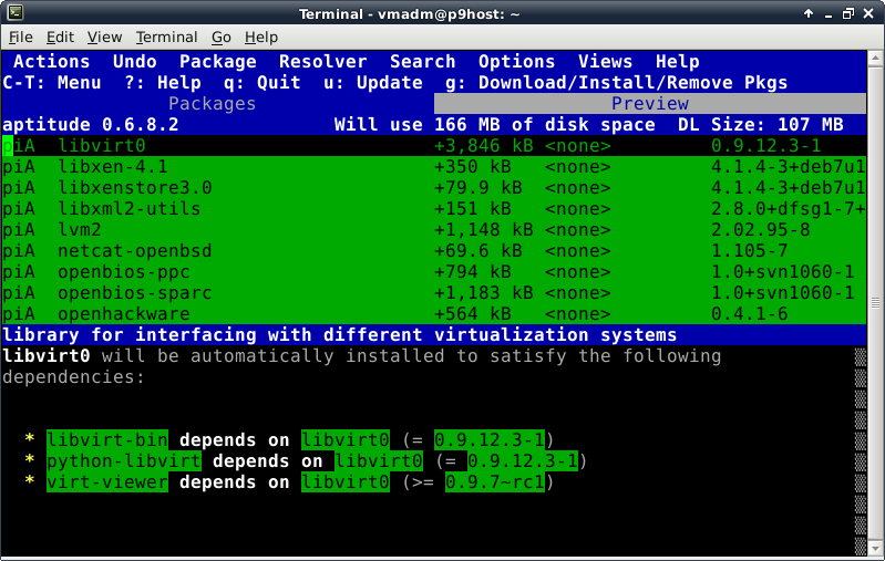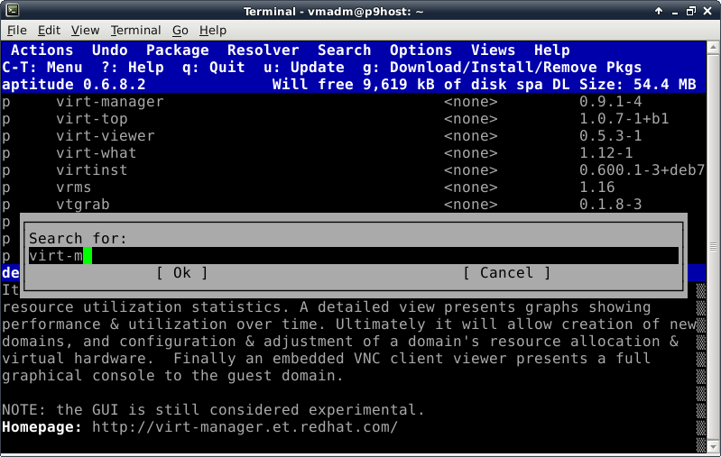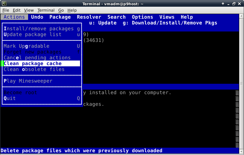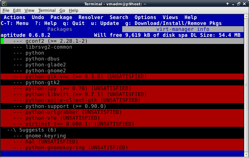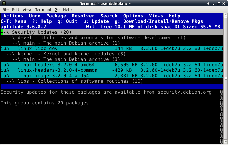 Before trying to install anything using aptitude, make the repository information up-to-date by pressing the lowercase "u" key (for update). Now we verify Internet connectivity is functioning properly. A lot of activity will be displayed looking something like this: