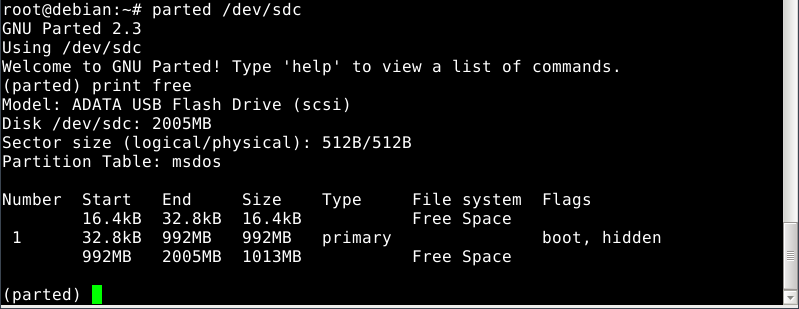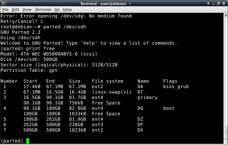 This is the USB-stick (parted works with non-GPT drives, too). Attempting to examine the sdd, sde, sdf, and sdg drives fails with "No medium found" dialogs that are dealt with by typing a lowercase "c" and pressing the Enter. The final drive, sdh, displays as expected: