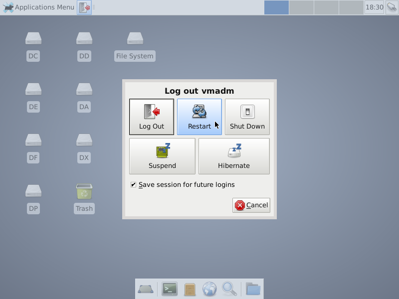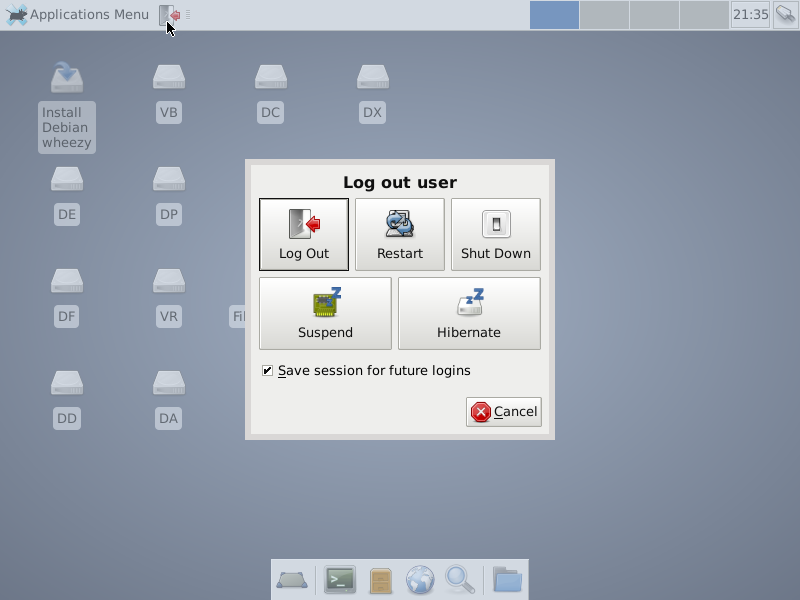 After getting your project computer to begin booting up, interact with your BIOS/boot loader as needed to get your system to use sda as the boot device. When the GRUB menu appears, make sure it advertises the system you installed in the previous subsection. If it does, you can let it default to a normal boot, or you can you the Up|Down Arrow keys to explore and test the other boot options. After you get it doing a normal boot, it should display before too long a GUI logon menu identifying the hostname you installed and the vmadm user you specified. That being so, login as that user specifying the password your defined during the installation dialogs. If that goes according to plan, you should shortly see a screen very much like that of the Debian Live desktop and almost identical to this: