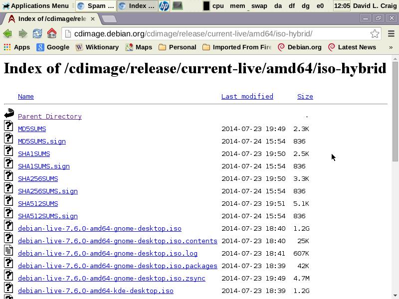 Point your browser at http://cdimage.debian.org/debian-cd/current-live/amd64/iso-hybrid/ using an appropriate computer (in my case, the same computer being used to demonstrate this project running a Debian Sid XFCE system in a partition this project will ignore by and large). The top of the page should look something like this (800x600):