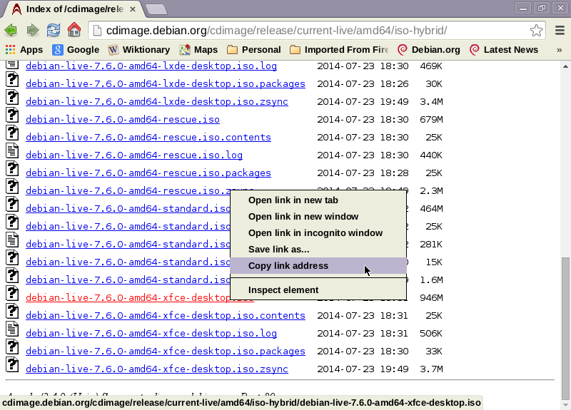 Scroll to the precise ISO file (for me, debian-live-7.6.0-amd64-xfce-desktop.iso) and copy its link to the clipboard. It should look something like the following image before you click to copy (under XFCE, that pop-up menu is produced by a right-click on the link you're interested in).