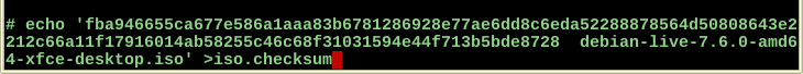 Back in the root session, type "echo '", paste in the clipboard, type "' >iso.checksum"; e.g.,