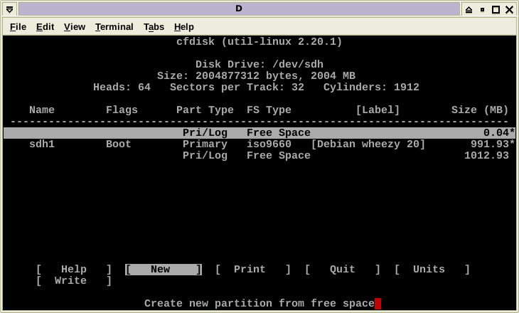 It looks like the media is ready. Enter two tabs, then Enter to exit cfdisk. Then run the appropriate command to prepare the system for removal of the stick from the USB port; e.g., "eject /dev/sdh". Now the USB-stick can be removed. I affixed an external label to mine that says, "Debian Live Stable Wheezy X86_64 Jul 2014". Last of all, delete the ISO and checksum files from /tmp unless you want to keep them around for some reason.