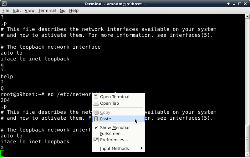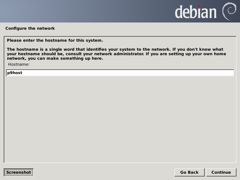 You may use what you prefer. I'm using "p9host". I don't show adding this host to your DNS zone, assuming you understand the need and know how to do that. There will also be a name for the Plan 9 virtual machine if you are setting up networking as this cookbook does, with virtual machines being visible on the same network as the host machine. There will be more on that after we get the host booted.