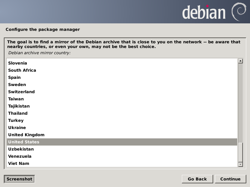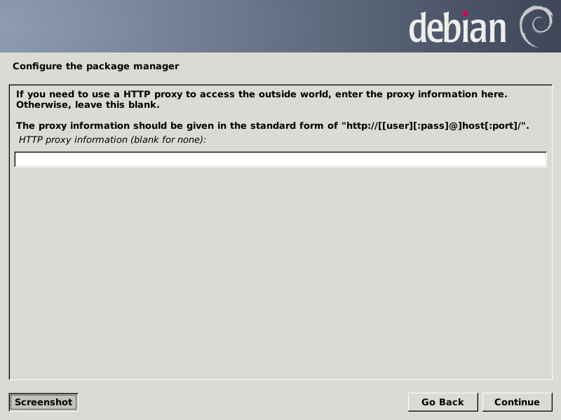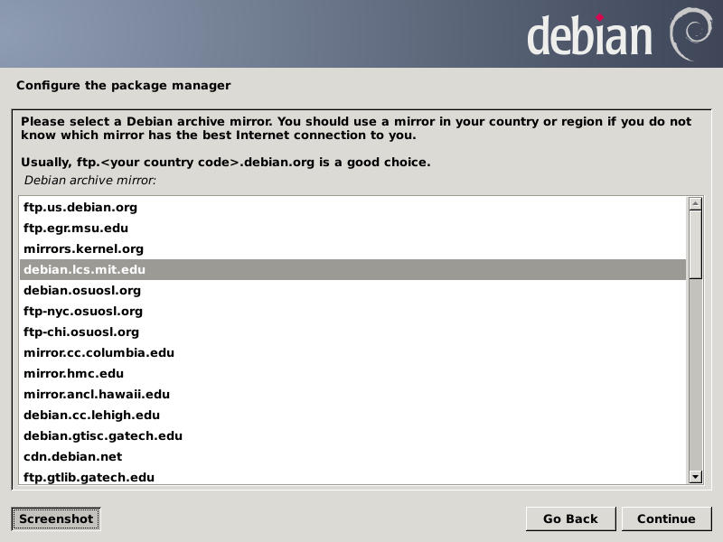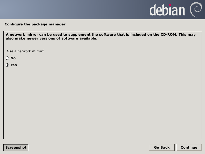 After all file systems and swap space have been prepared, the lengthy installation proper begins, which takes about five minutes on the Gigabyte. Next it prompts for information about using a mirror for the Debian package repositories.