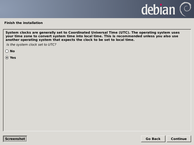 After installing GRUB and finishing the install proper, it will ask about the orientation of the system clock, which for my platform is UTC.
