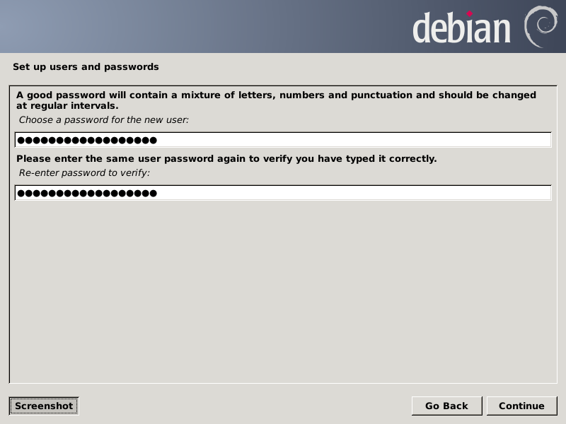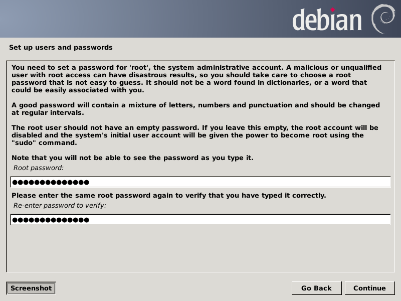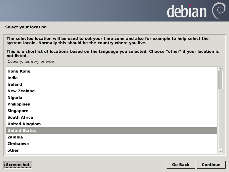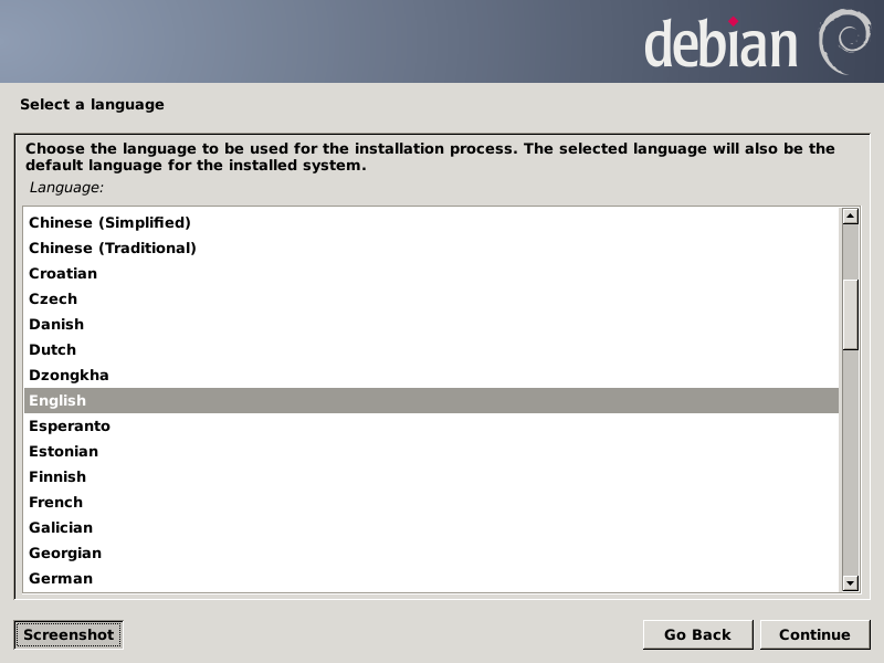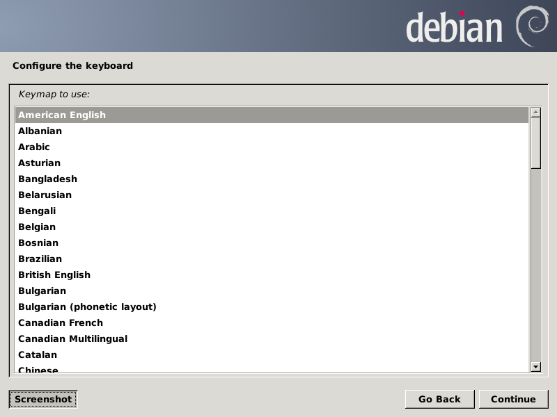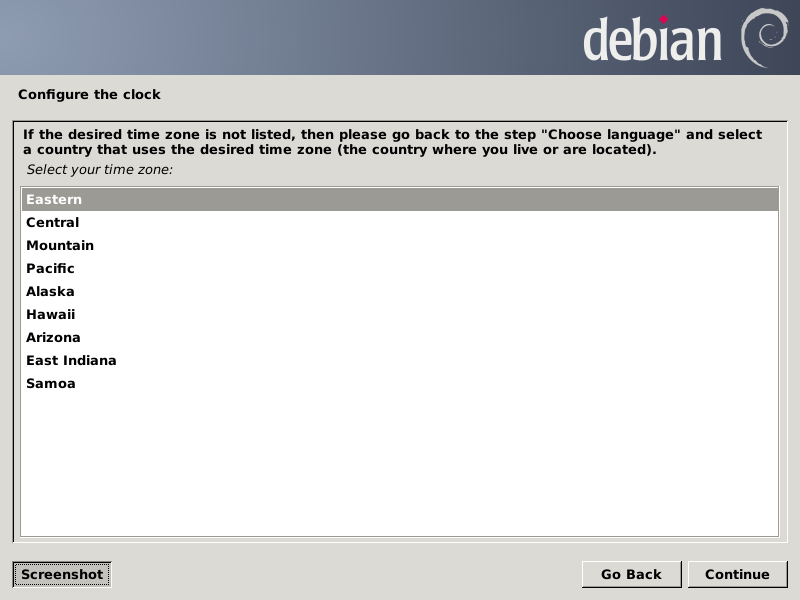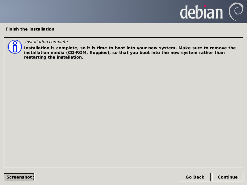 We are finished with the terminal emulator, so we enter a lowercase "q" and press Enter to exit parted, then type two Ctrl-D combos to dismiss it. Next we double-left-click on the Install Debian Wheezy icon to get the installer running, which, after a couple of terminal windows flash by, it should settle into the GUI. Choose the options you wish for the first three screens (all screens are shown just before clicking the Continue button):
