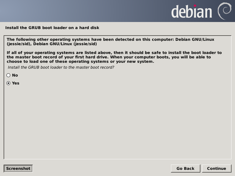 After asking about network proxies, it will configure the package manager, then GRUB. If it finds any bootable operating systems on all your disk devices, it will identify them, then dialog with you to determine where to install the boot loader. On my system, I tell it to use the MBR (of the sda drive).
