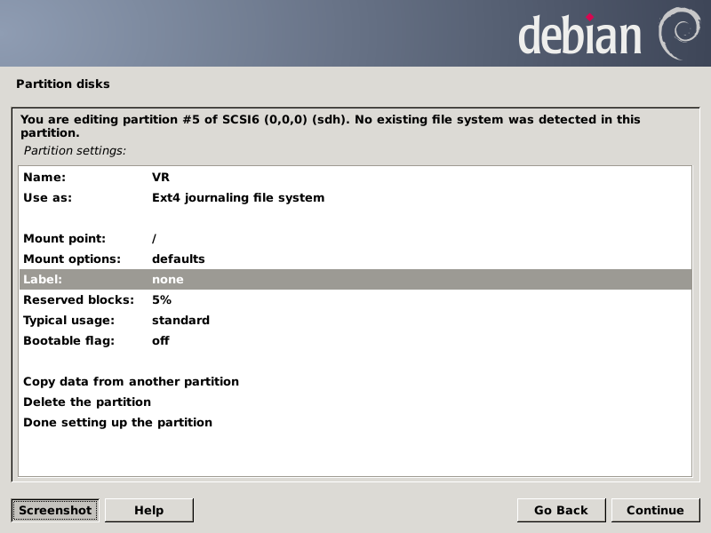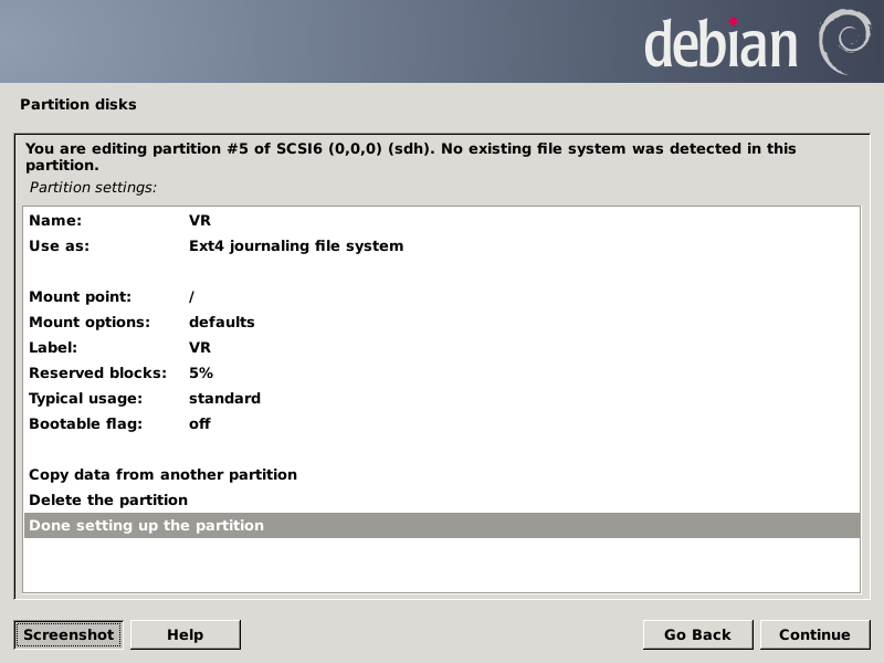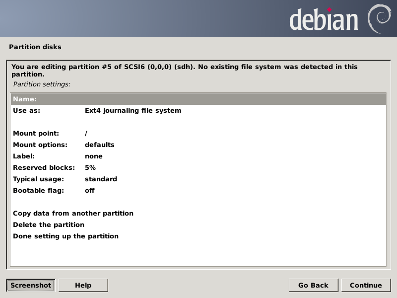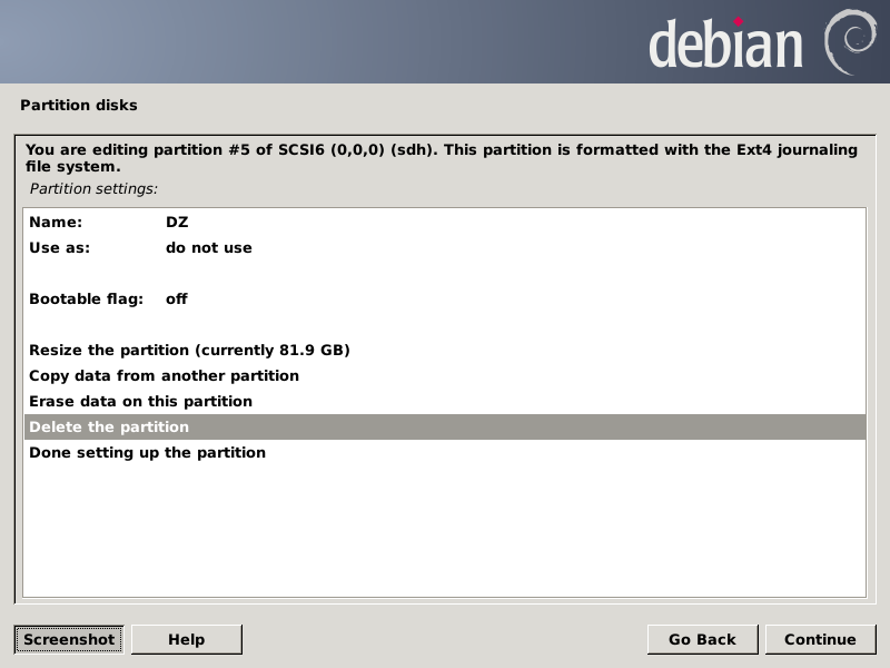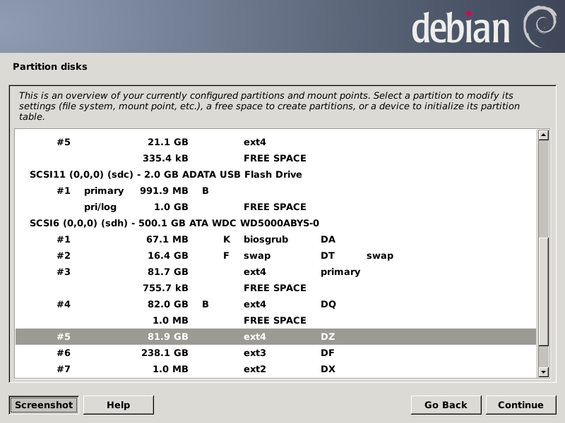 Note the "f" for the sda1 partition means it should be formatted. Now I have to scroll down to get to the sdh5 partition: