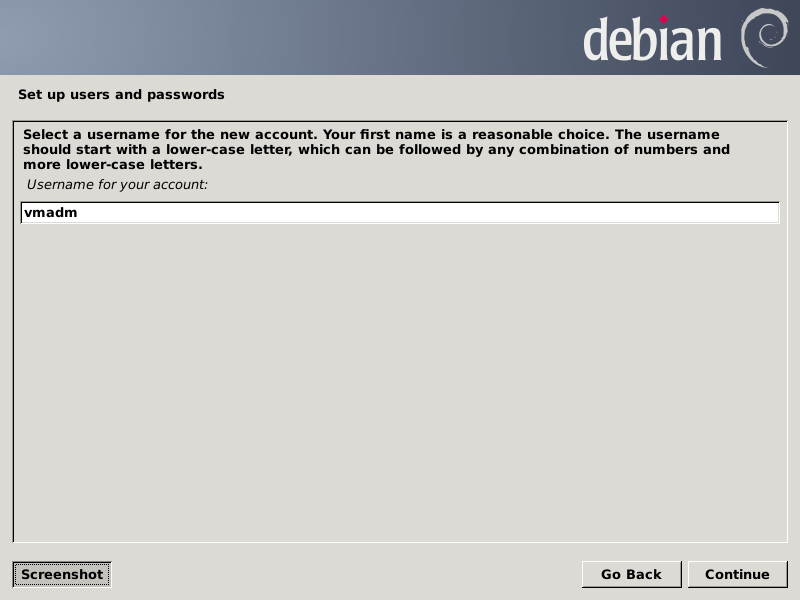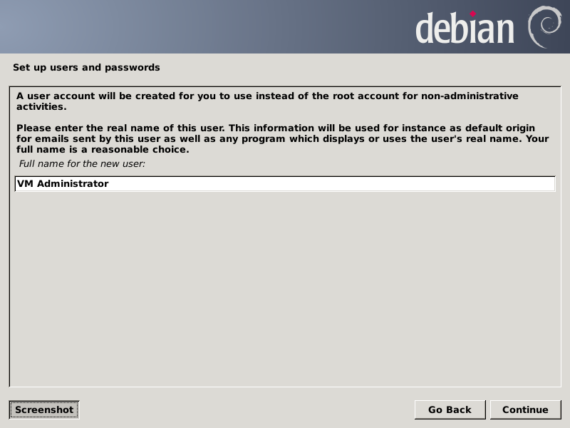 The next three screens define the initial non-root user for the virtual machine host system who should be the administrator of the virtual machines. You may use what you prefer. I'm using "VM Administrator" and "vmadm".